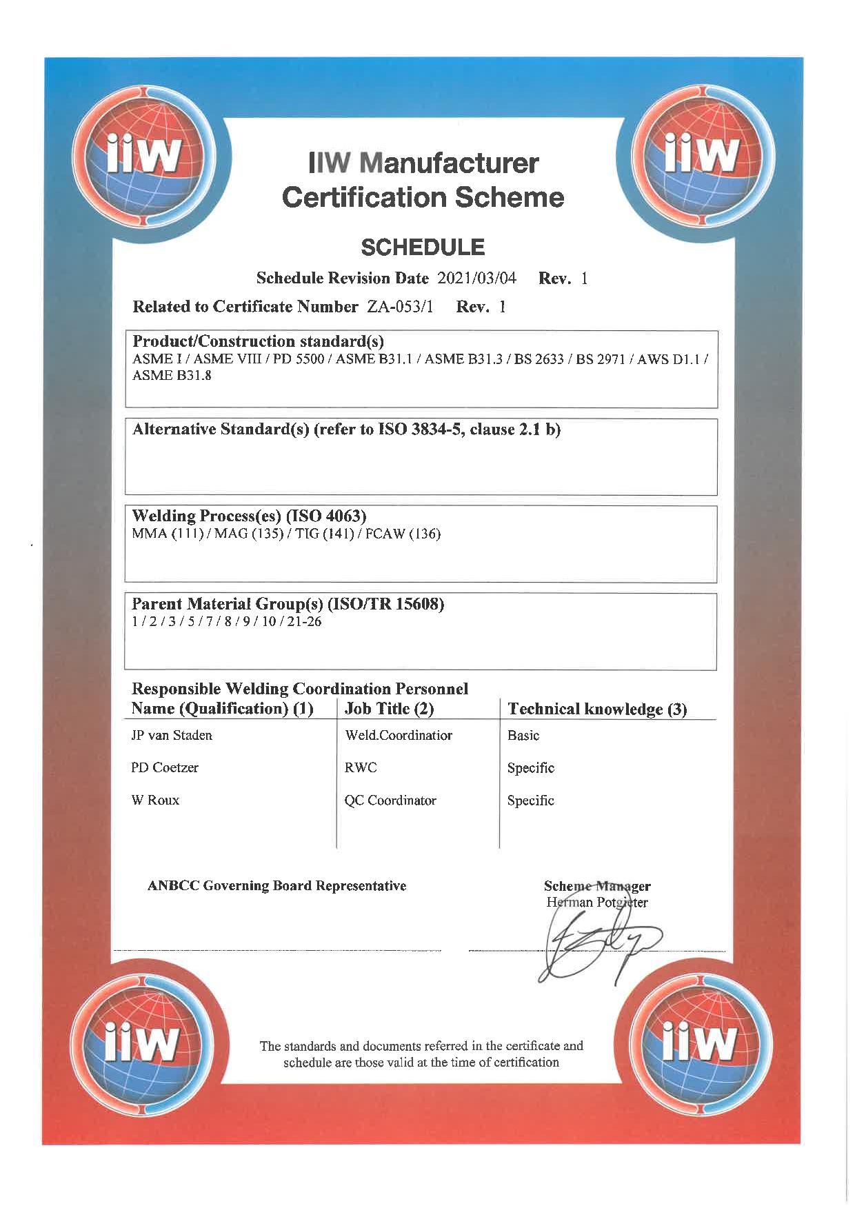 To be able to Fabricate and repair pressure equipment, pipe lines and auxiliary equipment Legally in accordance with the Regulations in the PER, SANS 347 and OSHACT it is mandatory for all Welding Companies to be ISO 3834 Certified.